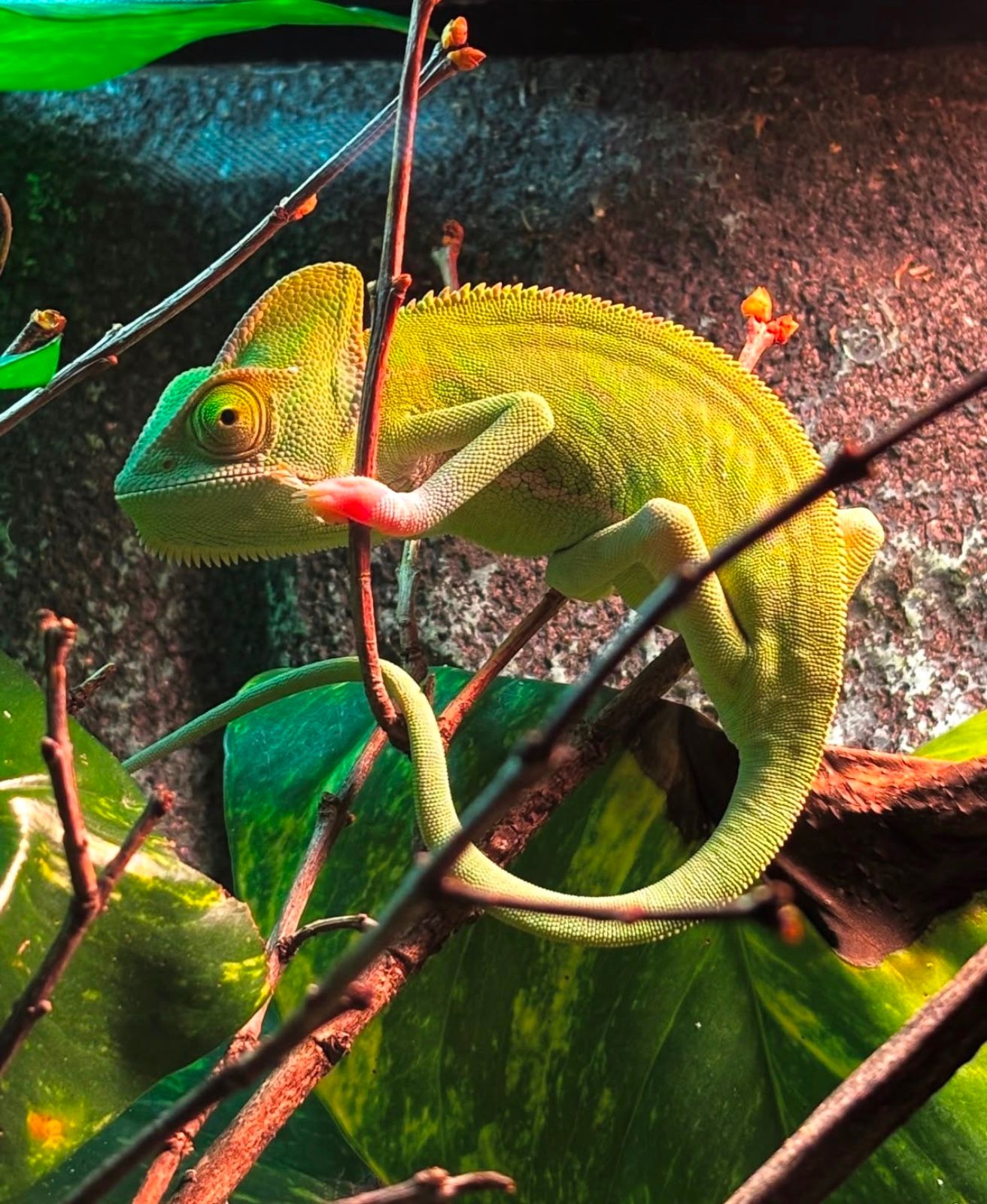En viktig sak är temperaturgradienten. Ett högt terrarium är naturligtvis det självklara valet och det hjälper till att skapa en temperaturskillnad; varmt uppe och svalt nere. En solplats är ett måste och just här kan man anpassa grenverket så att den kan sitta fritt och sola sig utan risk att bränna sig. Jag har sett bilder på riktigt otäcka brännskador, så räkna inte med att kameleonten vet vad som är bäst för den.