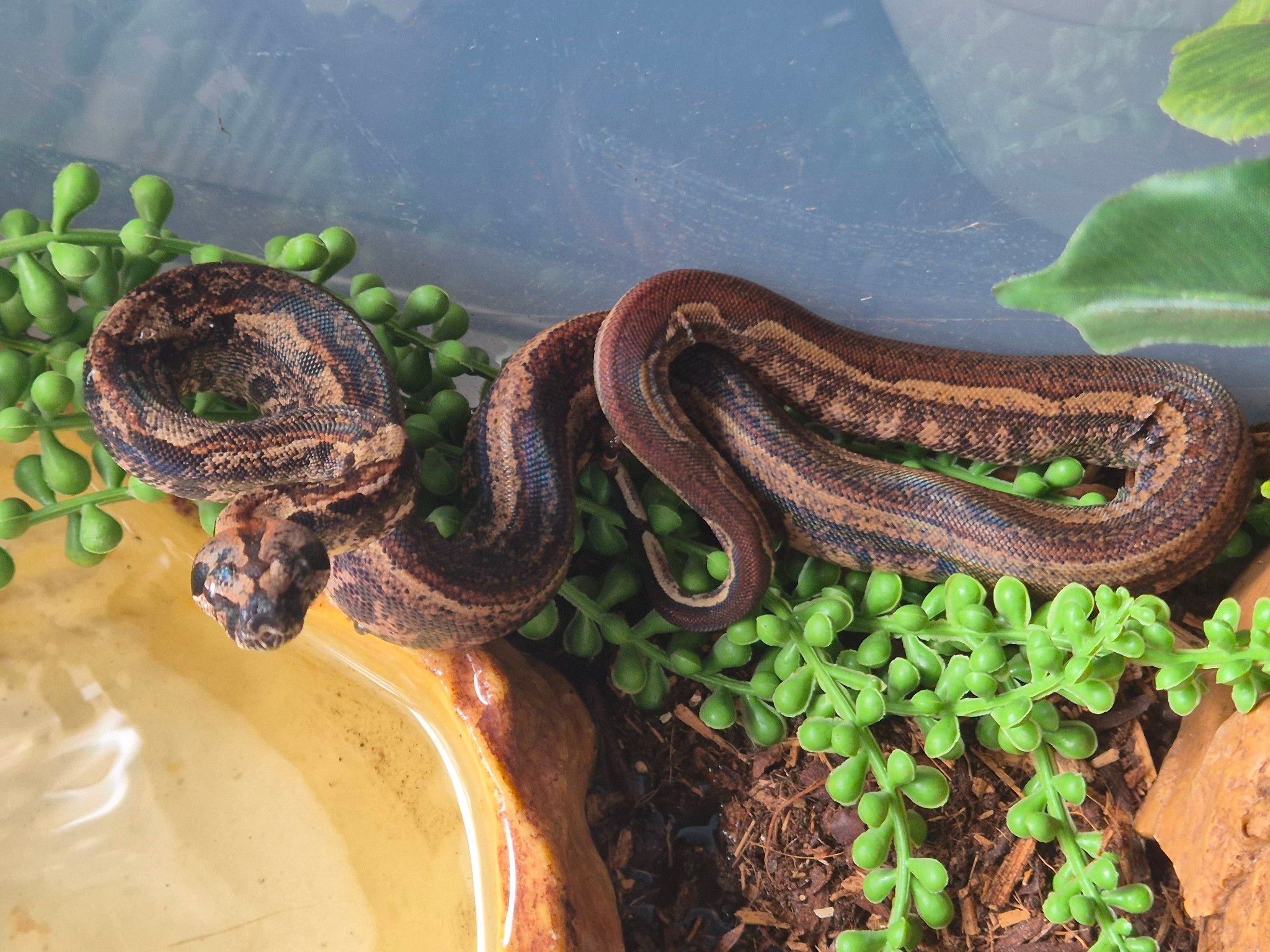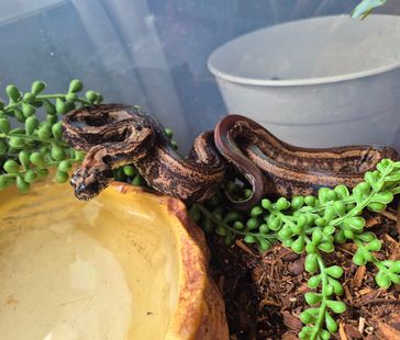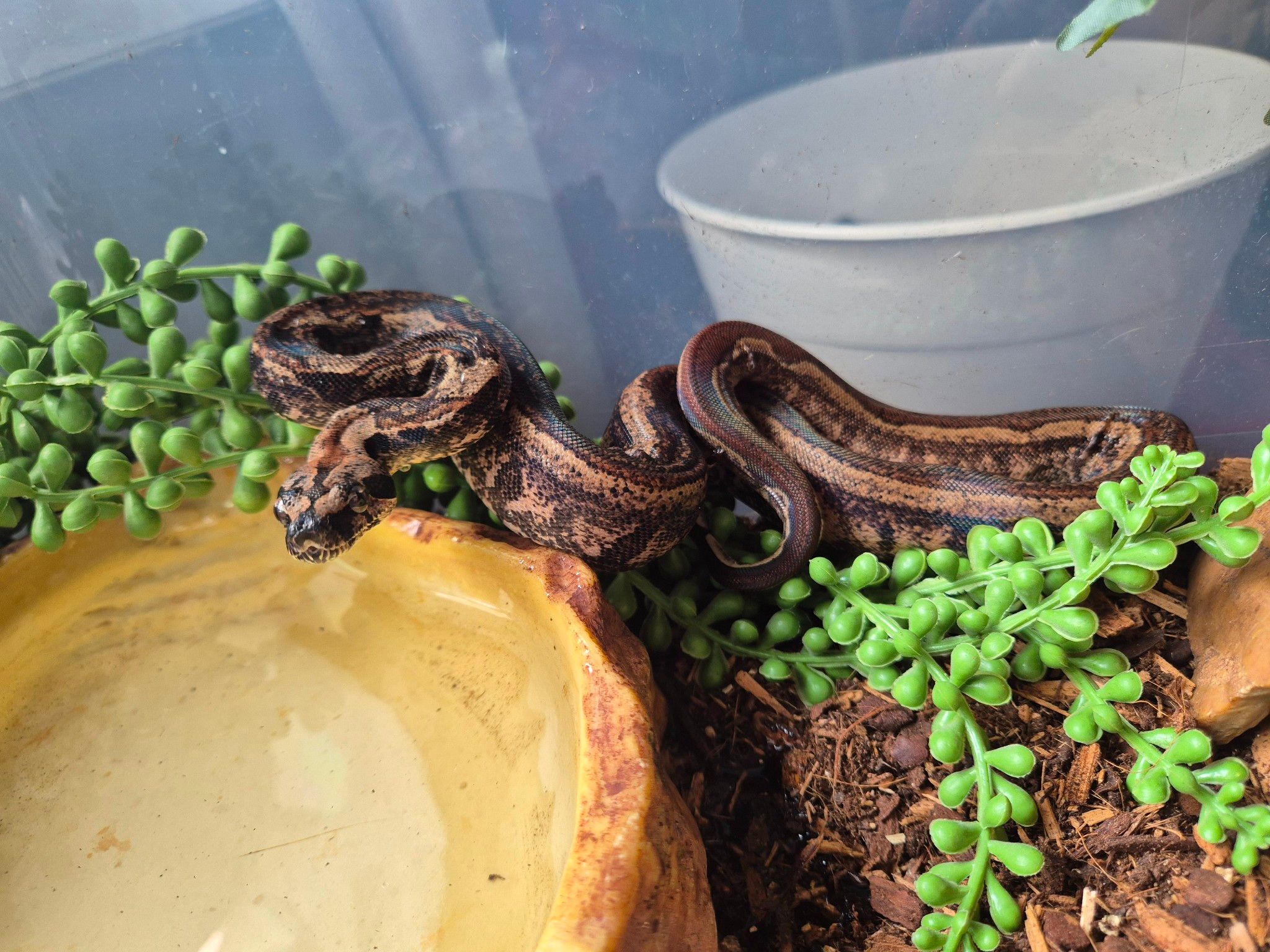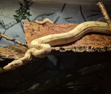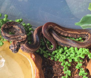 Ett stort, något uppvärmt, vattenkärl måste finnas, likaså ett torrt hörn av terrariet. Tänk på att terrariet helst ska vara ganska högt, då de gillar att klättra en hel del trots att det är en marklevande orm.