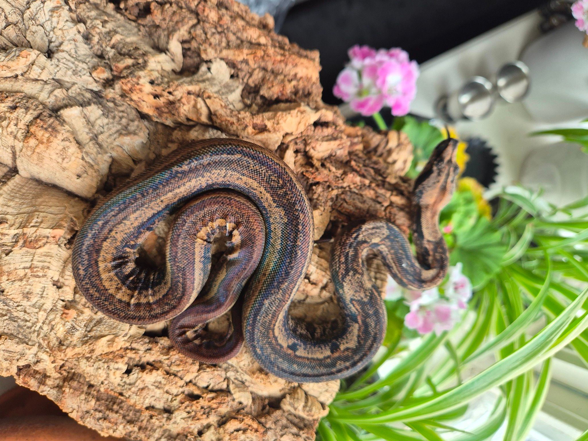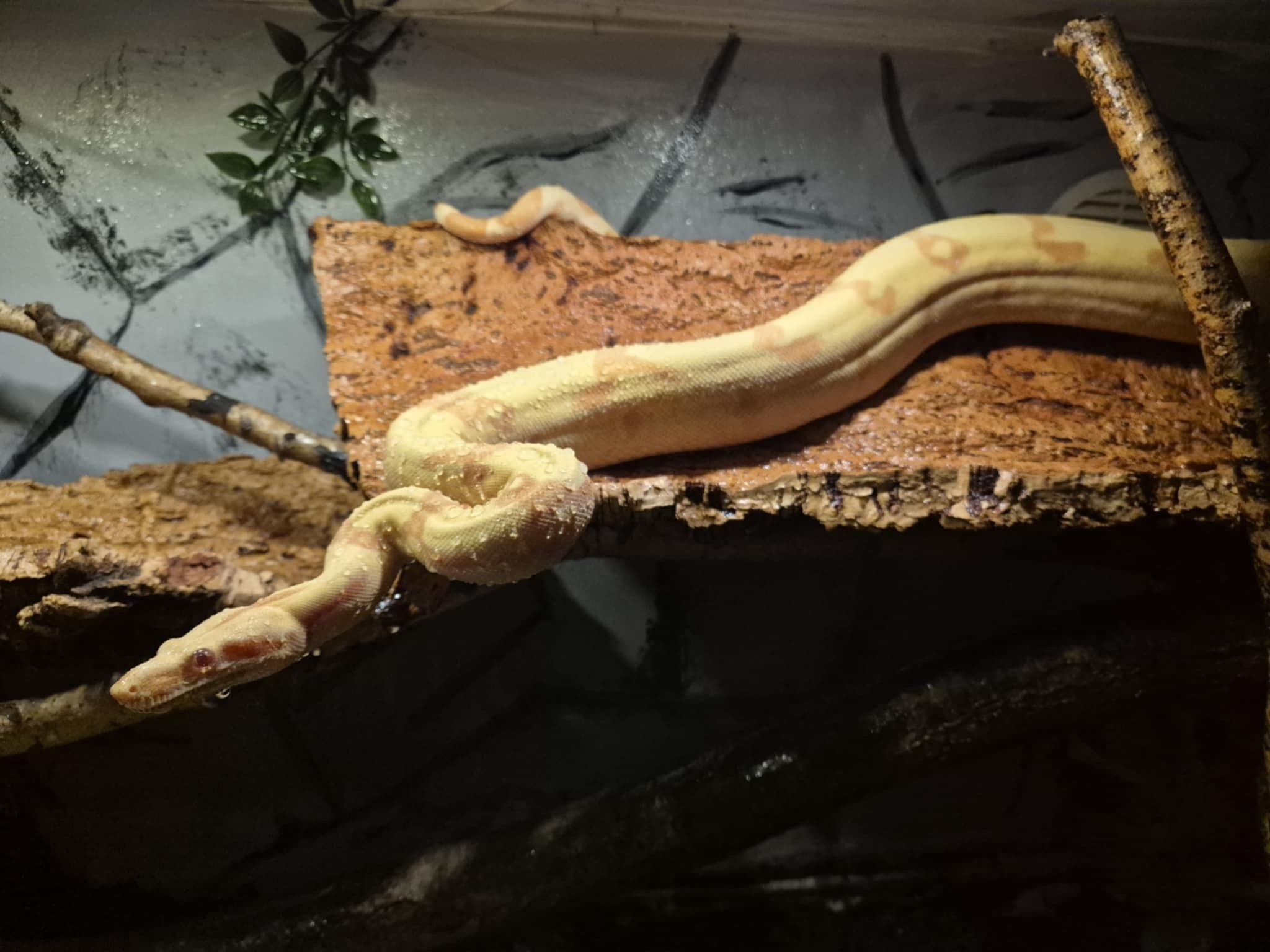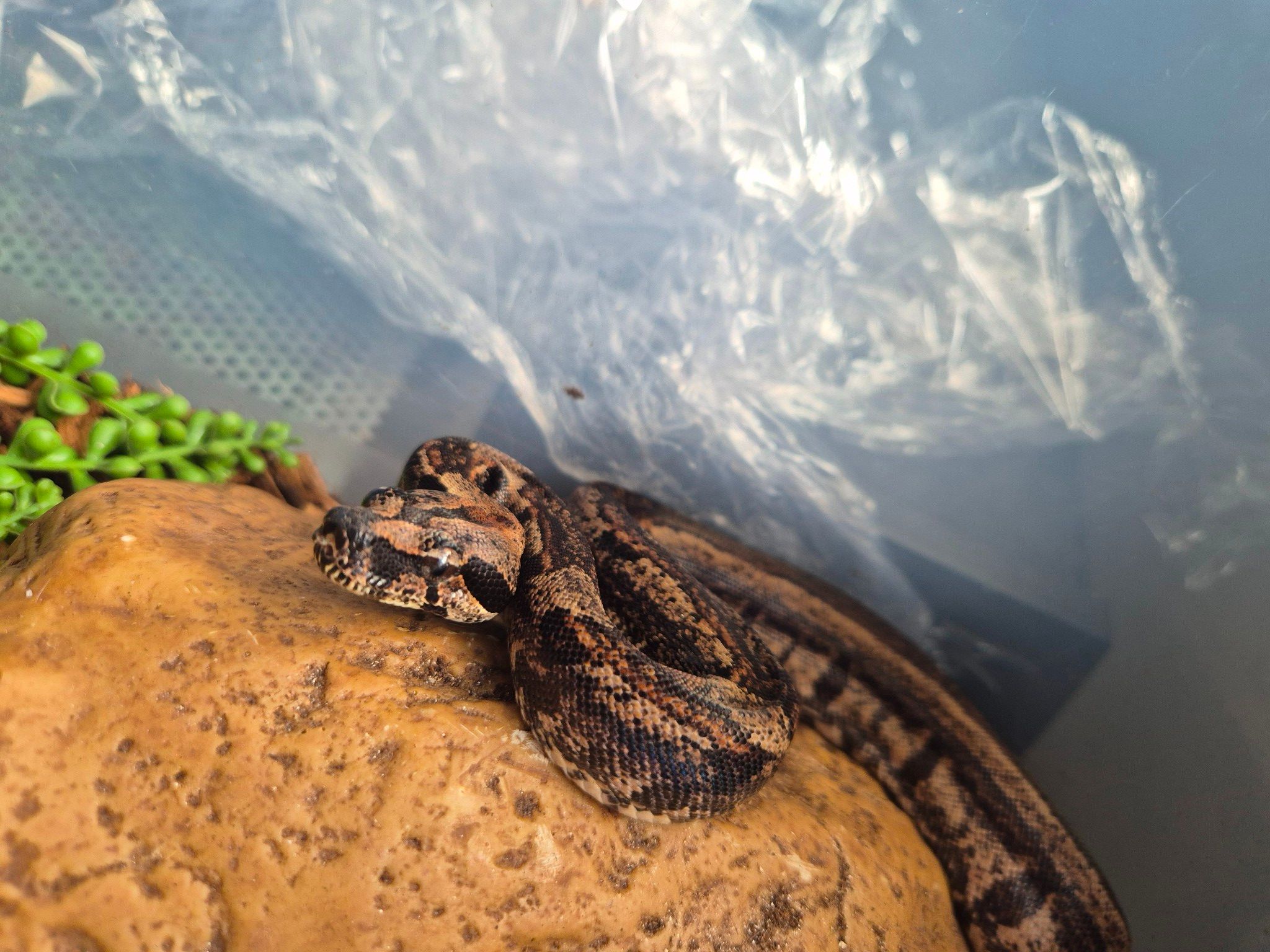 Ett stort, något uppvärmt, vattenkärl måste finnas, likaså ett torrt hörn av terrariet. Tänk på att terrariet helst ska vara ganska högt, då de gillar att klättra en hel del trots att det är en marklevande orm.
