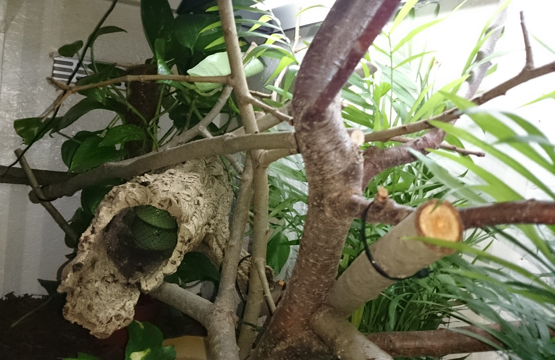 Det är alltid lite svårt att få insynsskydd till en trädlevande art men det är någonting man bör göra sitt bästa på att försöka uppnå så att ormen känner sig skyddad. Man kan exempelvis stoppa in en ihålig korkbit vid en av grenarna och där kan ormen spenderar sin dag liggandes tills lamporna släcks och det är dags att krypa ut och utforska.
