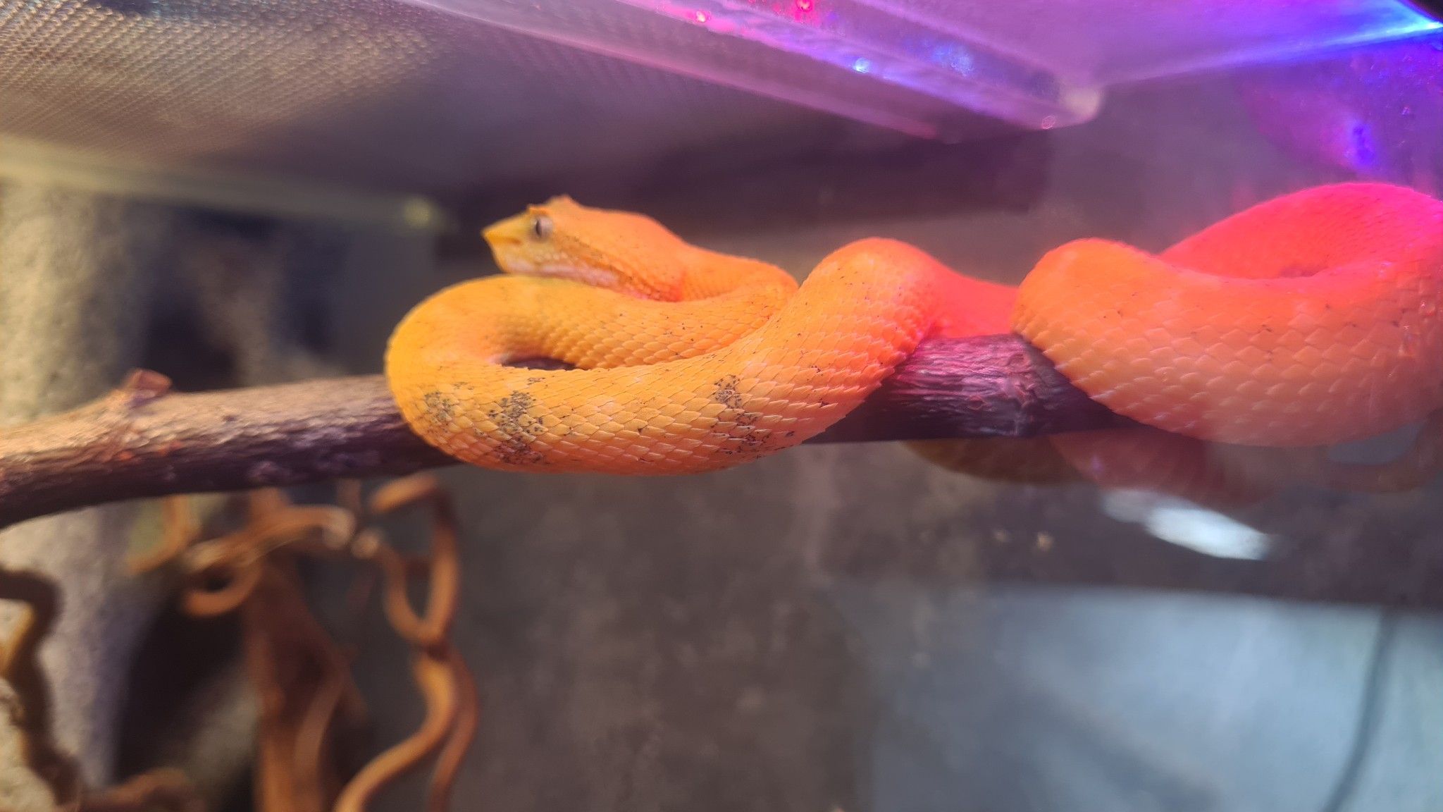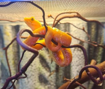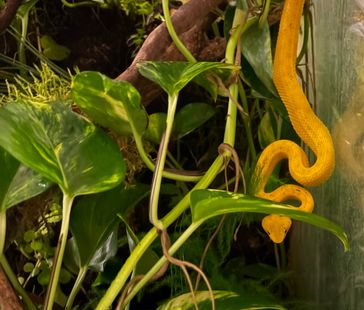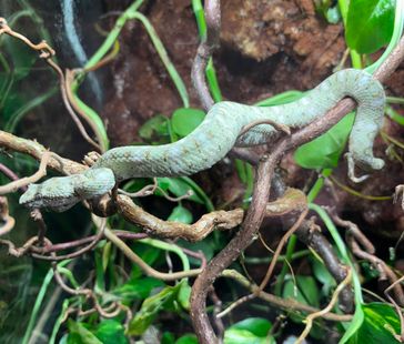 Vertikalt orienterade terrarier är att föredra då det som sagt är trädlevande ormar. En orm i denna storlek kräver enligt L80 mellan 0,04kvm och 0,12kvm i bottenyta beroende på ormens längd.