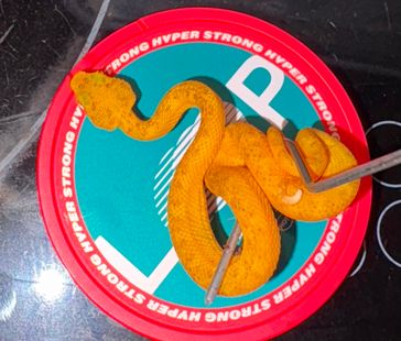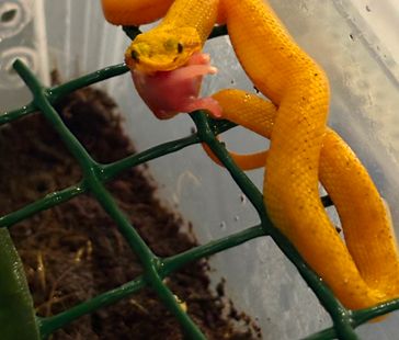 När du försöker att få ormen att hugga och ta bytet, slå då ormen försiktigt på svansen detta gör den förbannad och hugg brukar komma. Samt håll födan framför munnen på ungen och peta med foderdjuret på ungens mun.