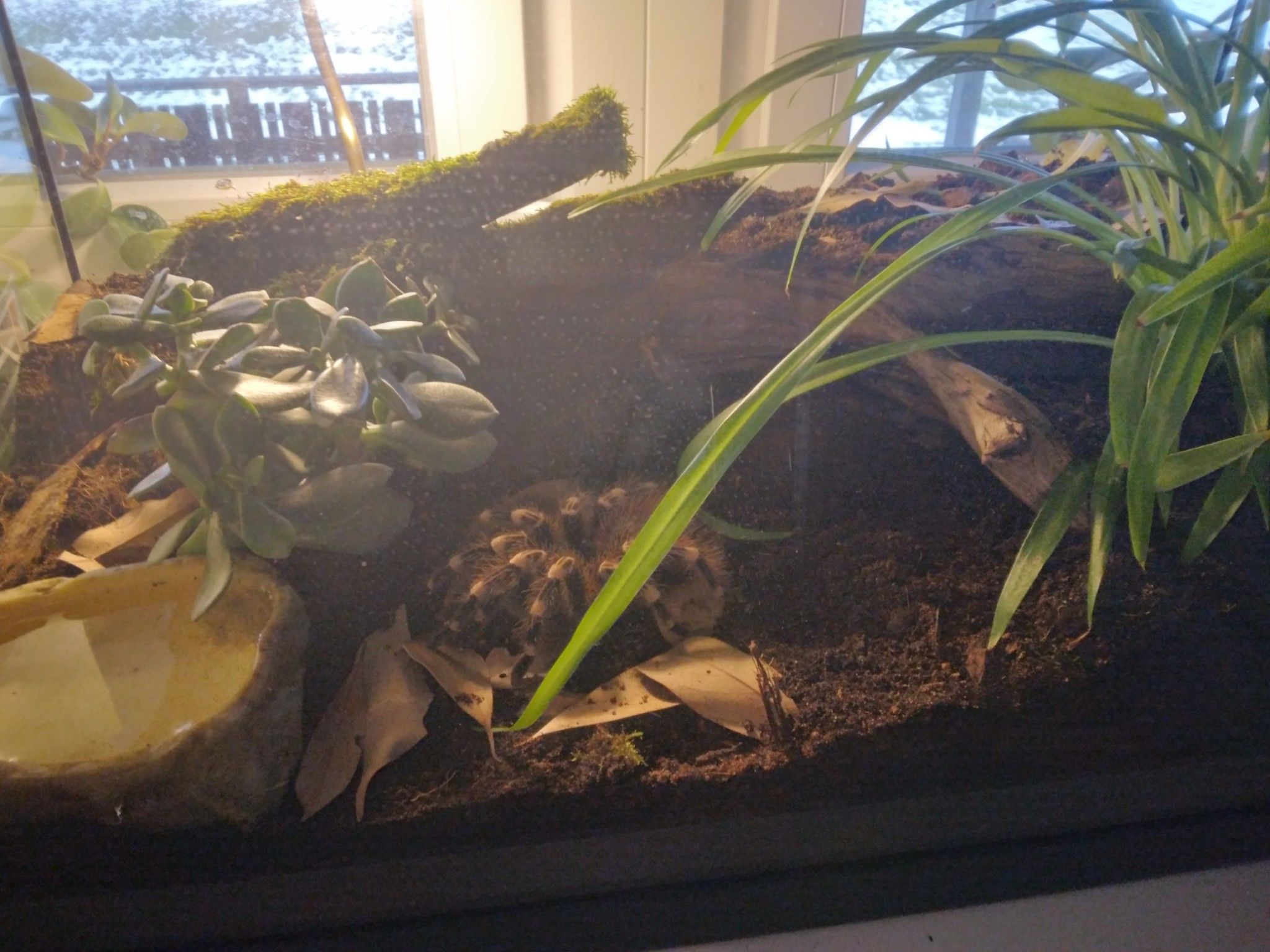En vattenskål bör alltid finnas tillgänglig för spindeln.