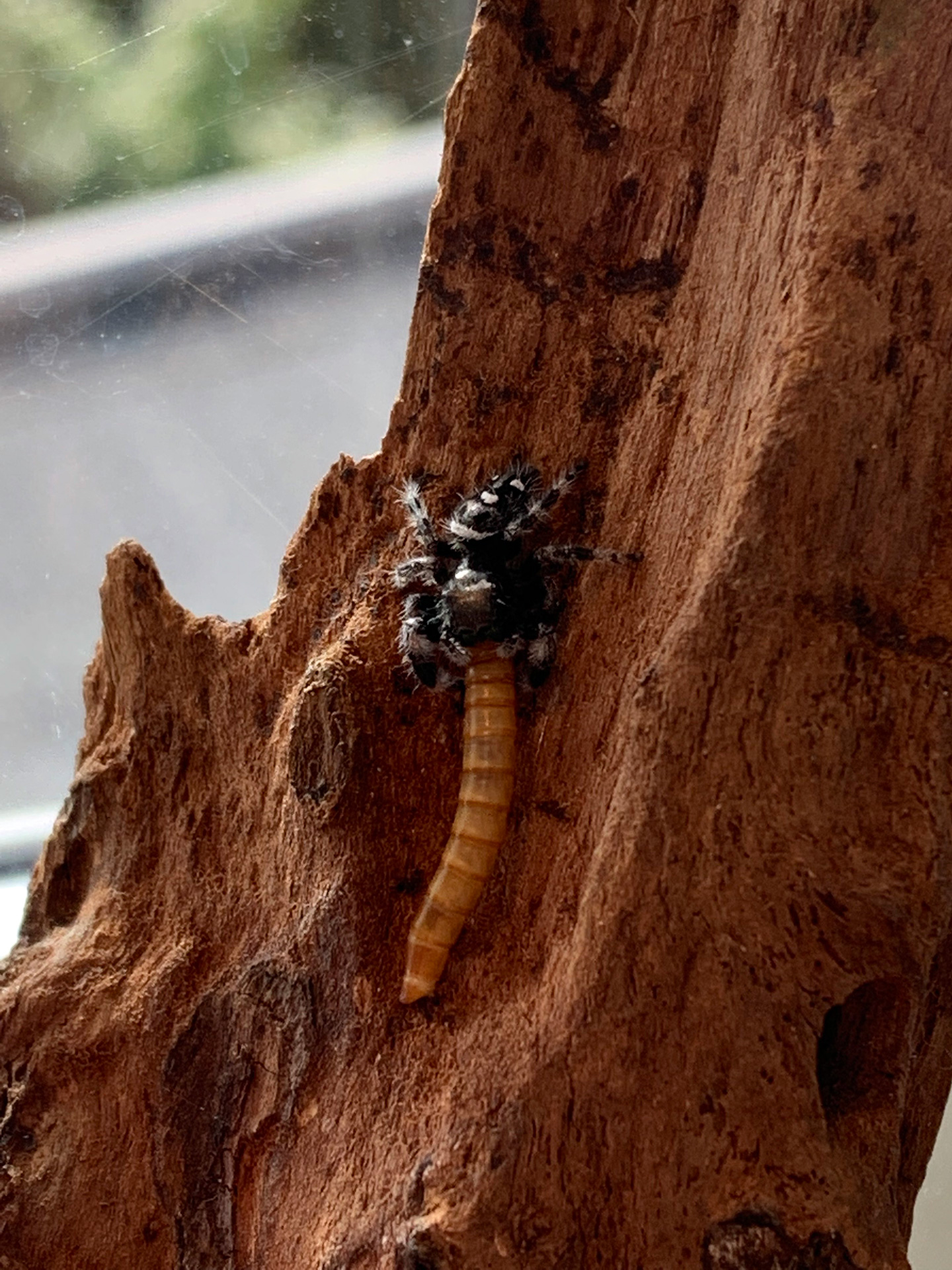 Hoppspindlar äter en stor variation av insekter. Beroende på storlek av individen kan de ta lite olika byten. Som ung så fungerar fruktflugor, buffalomaskar och annat i den storleken utmärkt. När den vuxit lite går det även bra med mindre syrsor, kackerlackor, mjölmask, vaxmottlarver, krullvingade flugor och mindre gräshoppor.